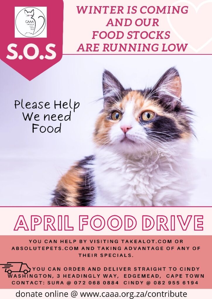 Capetonians Against Animal Abuse (CAAA) is asking for cat food donations in its April Food Drive – Kitty S.O.S. On Friday, 1 April 2022, the Cape Town charity posted a plea on Facebook, asking to urgently help with cat food donations to feed the feral cats of Cape Town during the winter season.